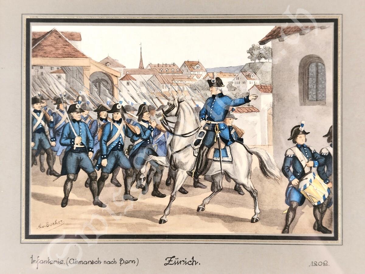 Aufschrift: Infanterie. (Abmarsch nach Bern) Zürich. 1802.