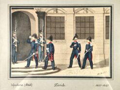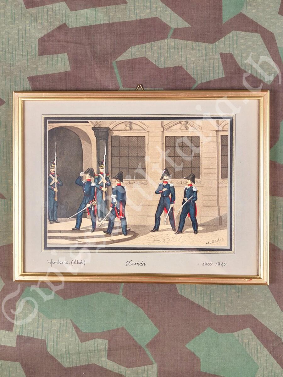 Dieses Bild ist aus der Aquarell-Serie von Albert von Escher mit dem Titel «Die schweizerischen Milizen des 19. Jahrhunderts». Das Bild ist hinter Glas gerahmt.