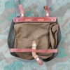 Der Brotsack ist aus Leder, Kunstleder und Stoff gefertigt. Der Trageriemen ist fest verbunden und die Länge ist verstellbar. Mit den drei Lederriemen kann der Brotsack am Rucksack befestigt werden.