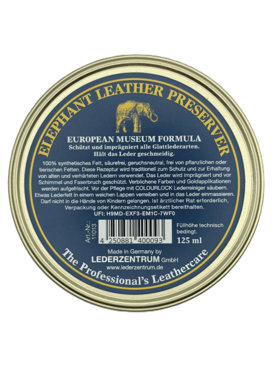 Der Elephant Leather Preserver ist ein hochwertiges Lederfett zur Pflege von mattem bis glänzendem Glattleder. Es schützt das Leder zuverlässig, wirkt imprägnierend und sorgt für nachhaltige Pflege. Besonders geeignet ist es für Fettleder und Neckleder. Die Rezeptur basiert zu 100 % auf synthetischem Fett, ist säurefrei, geruchsneutral und enthält weder pflanzliche noch tierische Bestandteile. Dank seiner hohen Ergiebigkeit ist bereits eine geringe Menge ausreichend.