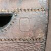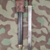 Das Faschinenmessers hat eine Klinge mit Sägerücken. Die Scheide ist aus geschwärztem Leder mit gedrahteter Garnitur.
