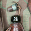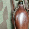 Die Feldflasche ist aus grünem Glas, welches mit Leder umwickelt wurde, gefertigt und fasst ca. 0.375 Liter.