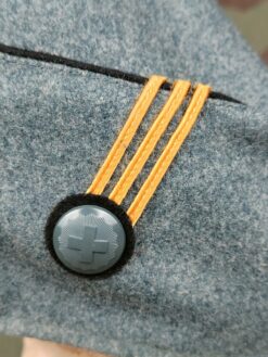 Um die Augen vor der Sonne zu schützen, kann ein Schirm heruntergeklappt werden. Bei kalter Witterung kann der Rand komplett heruntergeklappt werden und man erhält dadurch eine Art Sturmhaube. Diese Feldmütze nach Ord. 1949 ist mit einem Zierknopf der Ord. 1972 versehen.