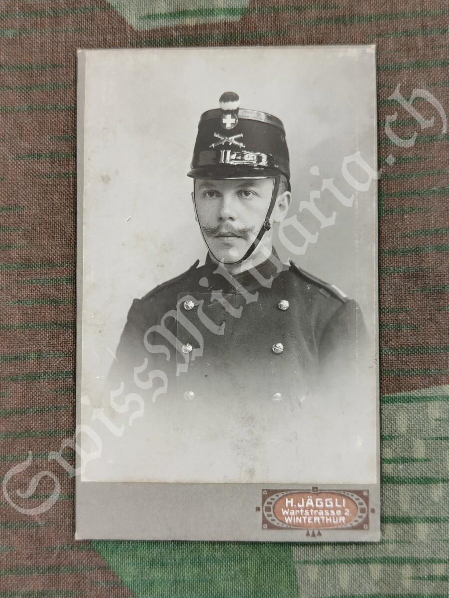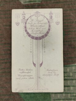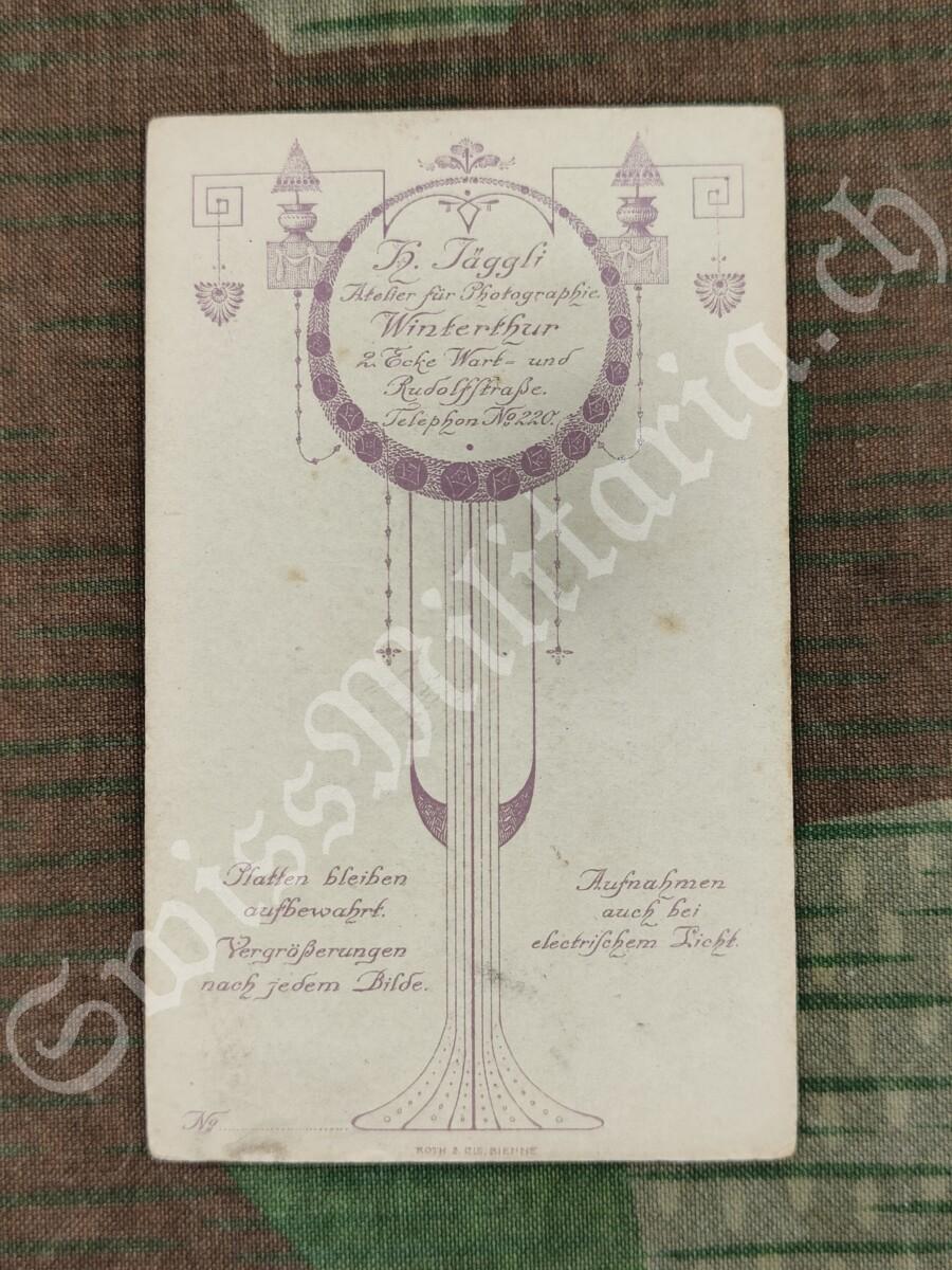 - Rückseite: H. Jäggli Atelier für Photographie Winterthur 2. Ecke Wart- und Rudolfstraße. Telephon No 220. Platten bleiben aufbewahrt. Vergrößerungen nach jedem Bilde. Aufnahmen auch bei elektrischem Licht.