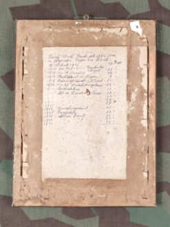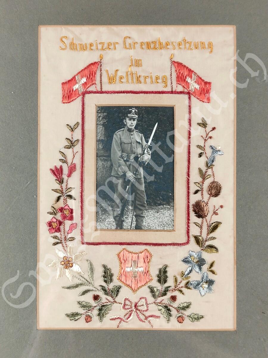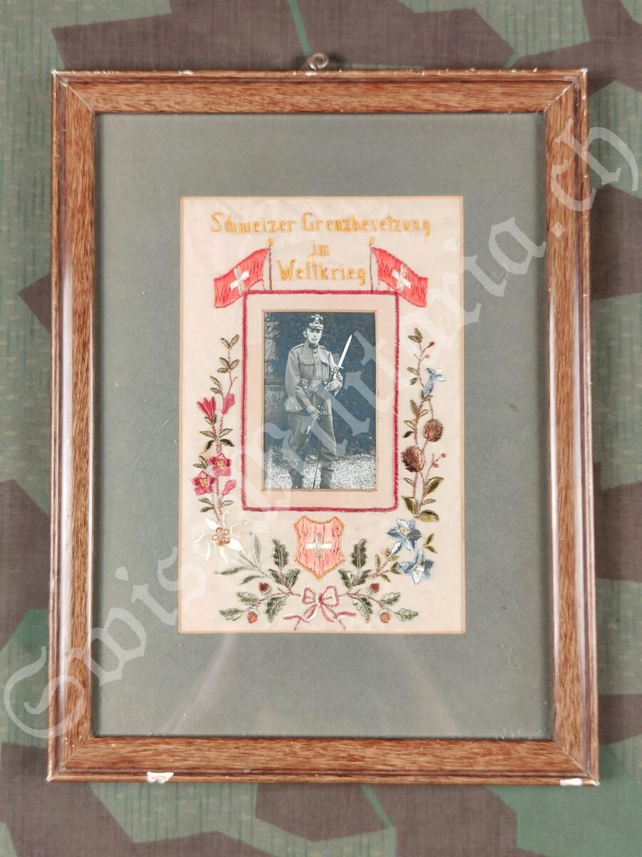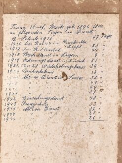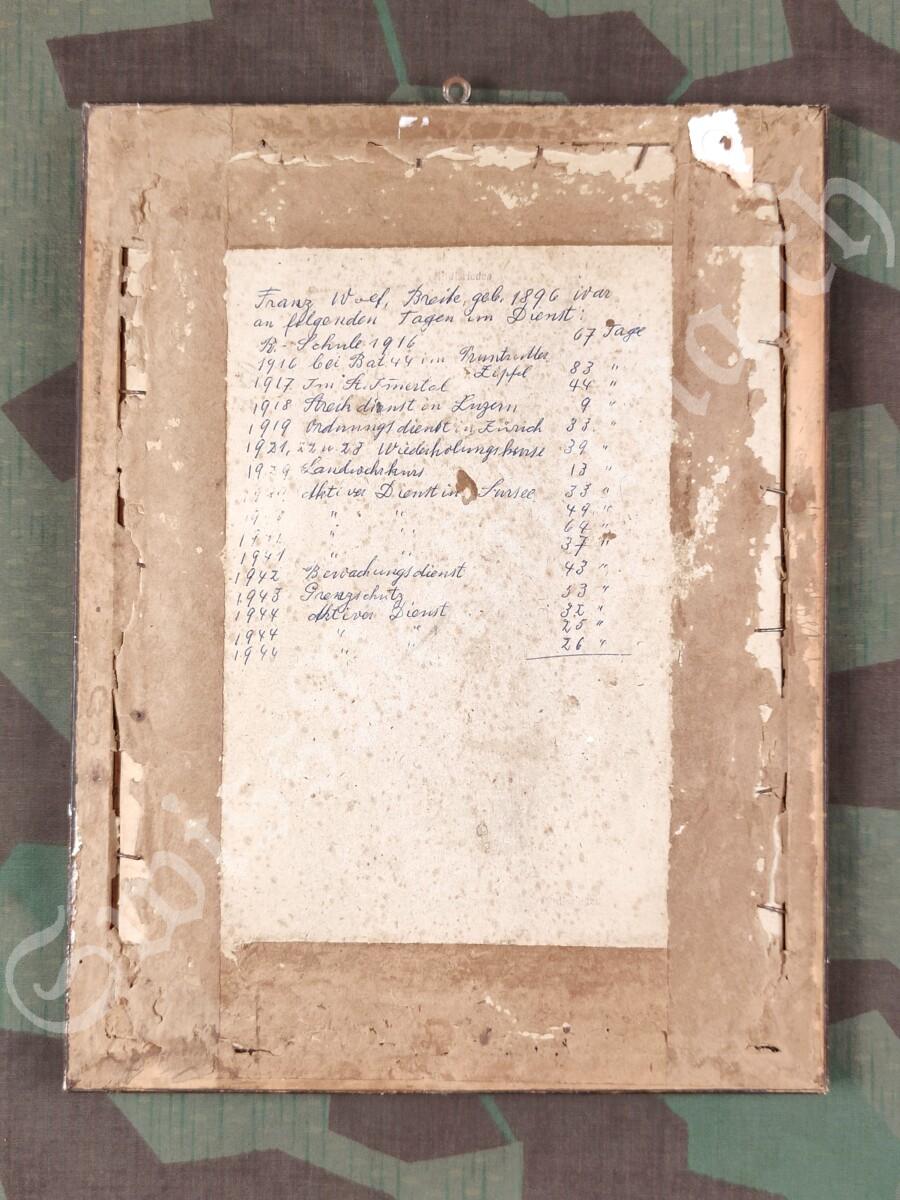 Bei diesem hinter Glas gerahmten Foto handelt es sich um ein Erinnerungsstück aus dem 1. Weltkrieg. Auf dem Foto ist Füsilier Franz Wolf, geboren 1896, zu sehen. Auf der Rückseite hat er all seine Diensttage aufgeschrieben von seiner Rekrutenschule 1916 bis zum letzten Aktiven Dienst 1944 im 2. Weltkrieg. Insgesamt sind es 650 Diensttage.