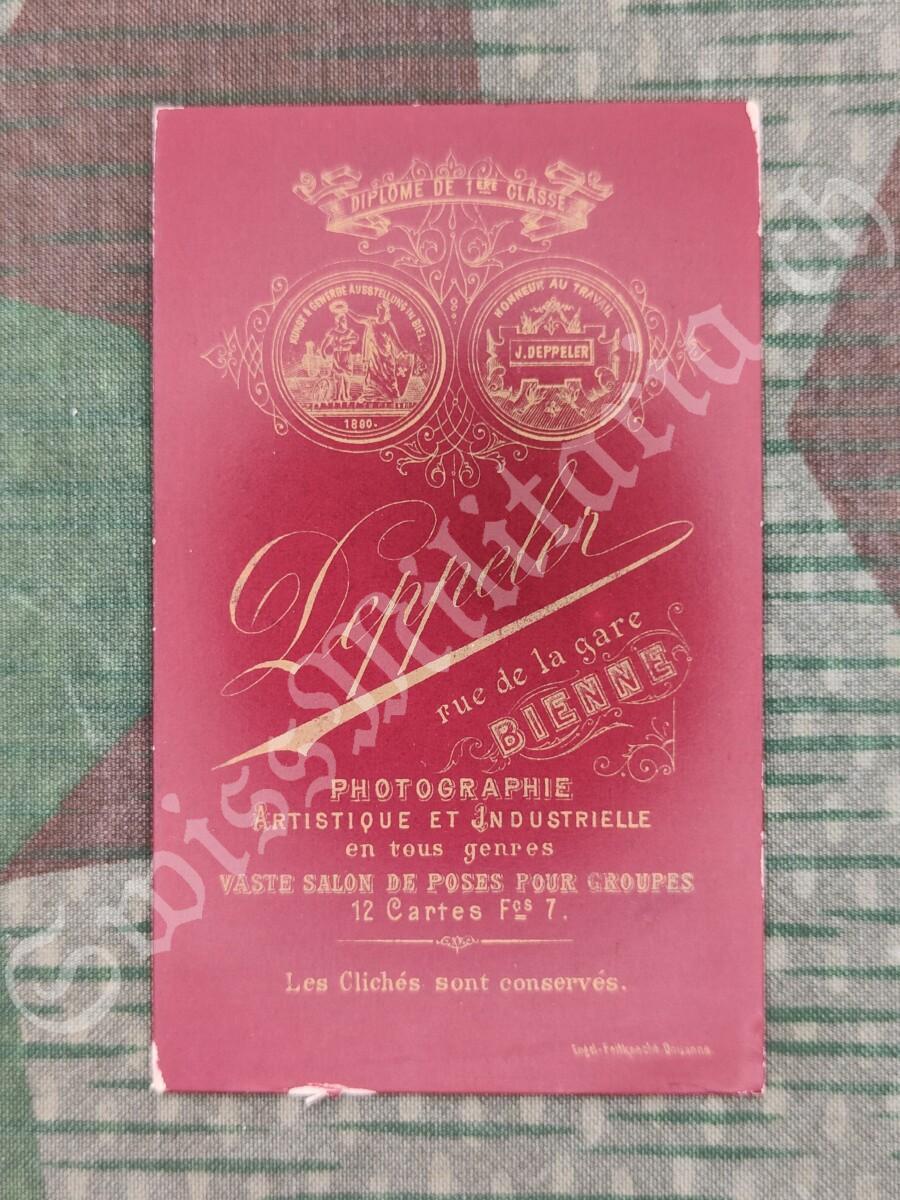 - Rückseite: DIPLÔME DE 1 ERE CLASSE KUNST & GEWERBE AUSSTELLUNG IN BIEL. 1880 HONNEUR AU TRAVAIL J. DEPPELER Deppeler rue de la gare BIENNE PHOTOGRAPHIE ARTISTIQUE ET JNDUSTRIELLE en tous genres VASTE SALON DE POSES POUR GROUPES 12 Cartes Fcs 7. Les Clichés sond conservés.