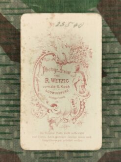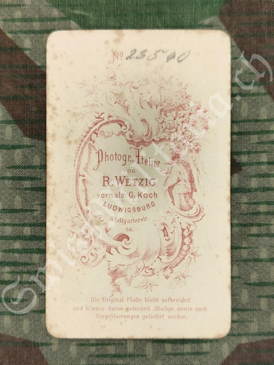 - Rückseite: No Photogr. Atelier von R. WETZIG vormal. G. Koch LUDWIGSBURG Stuttgarterstr. 56. Die Original-Platte bleibt aufbewahrt und können davon jederzeit Abzüge sowie auch Vergrösserungen geliefert werden.