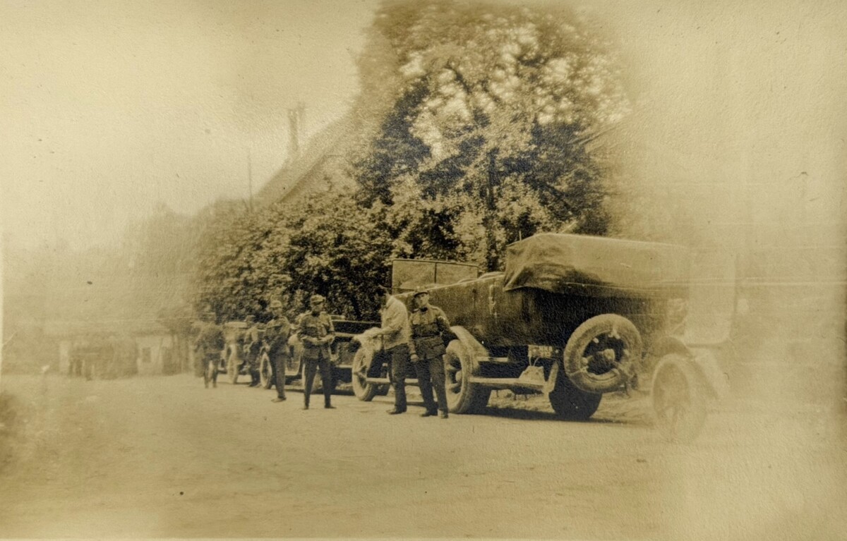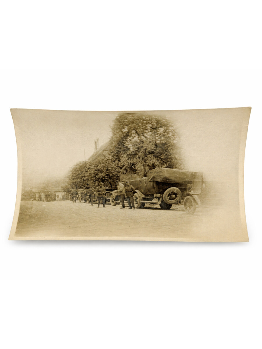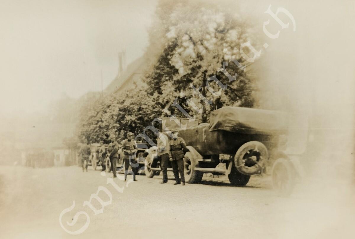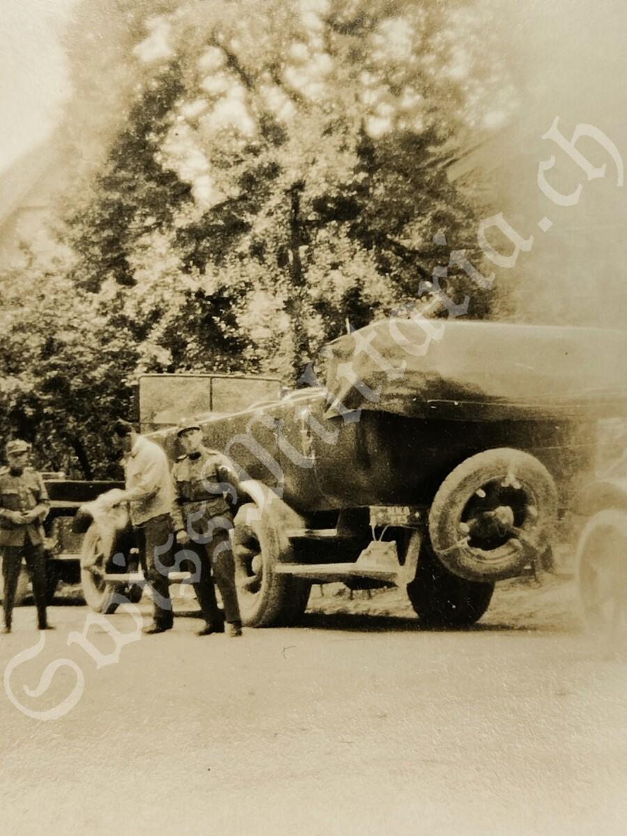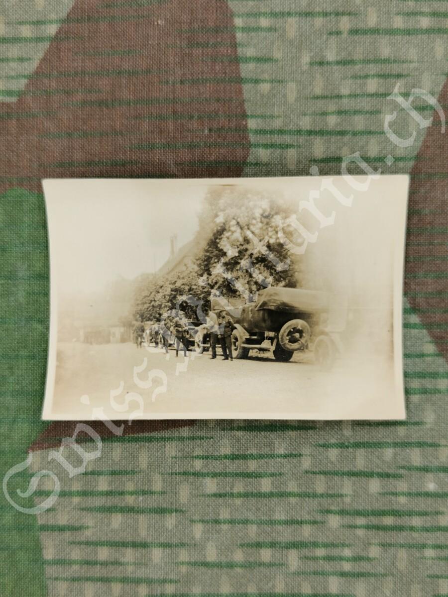 Foto Personentransportwagen Saurer 2A in Kolonne und Motorfahrer, (03) Korporal mit Soldaten, um 1925