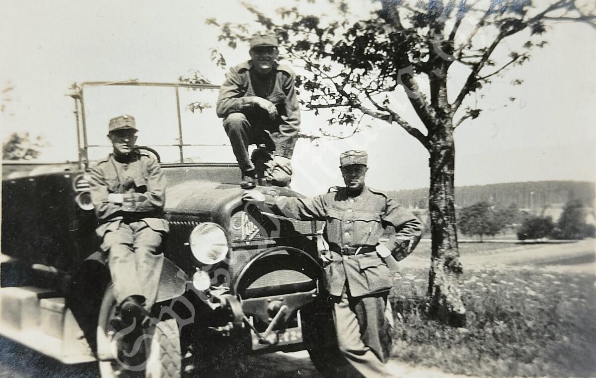 Foto Personentransportwagen Saurer 2A und Motorfahrer, (03) Korporal mit Soldaten, um 1925