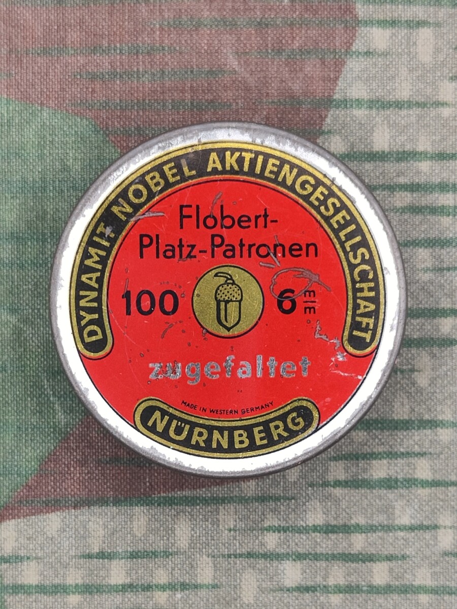 Aufschrift: DYNAMIT NOBEL AKTIENGESELLSCHAFT NÜRNBERG Flobert-Platz-Patronen 100 6 mm zugefaltet MADE IN WESTERN GERMANY
