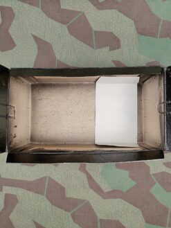 Die Munitionsschachtel ist leer und hat eine 3-sprachige Aufschrift.