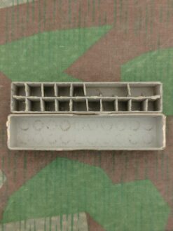 Die Munitionsschachtel ist leer und hat eine 3-sprachige Aufschrift.