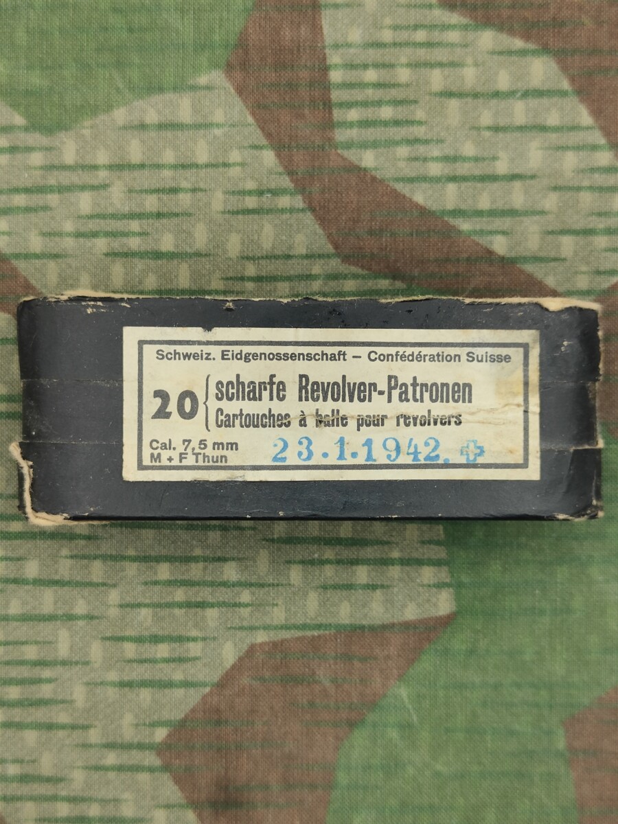 Aufschrift: Schweiz. Eidgenossenschaft 20 scharfe Revolver-Patronen Cal. 7,5 mm M+F Thun