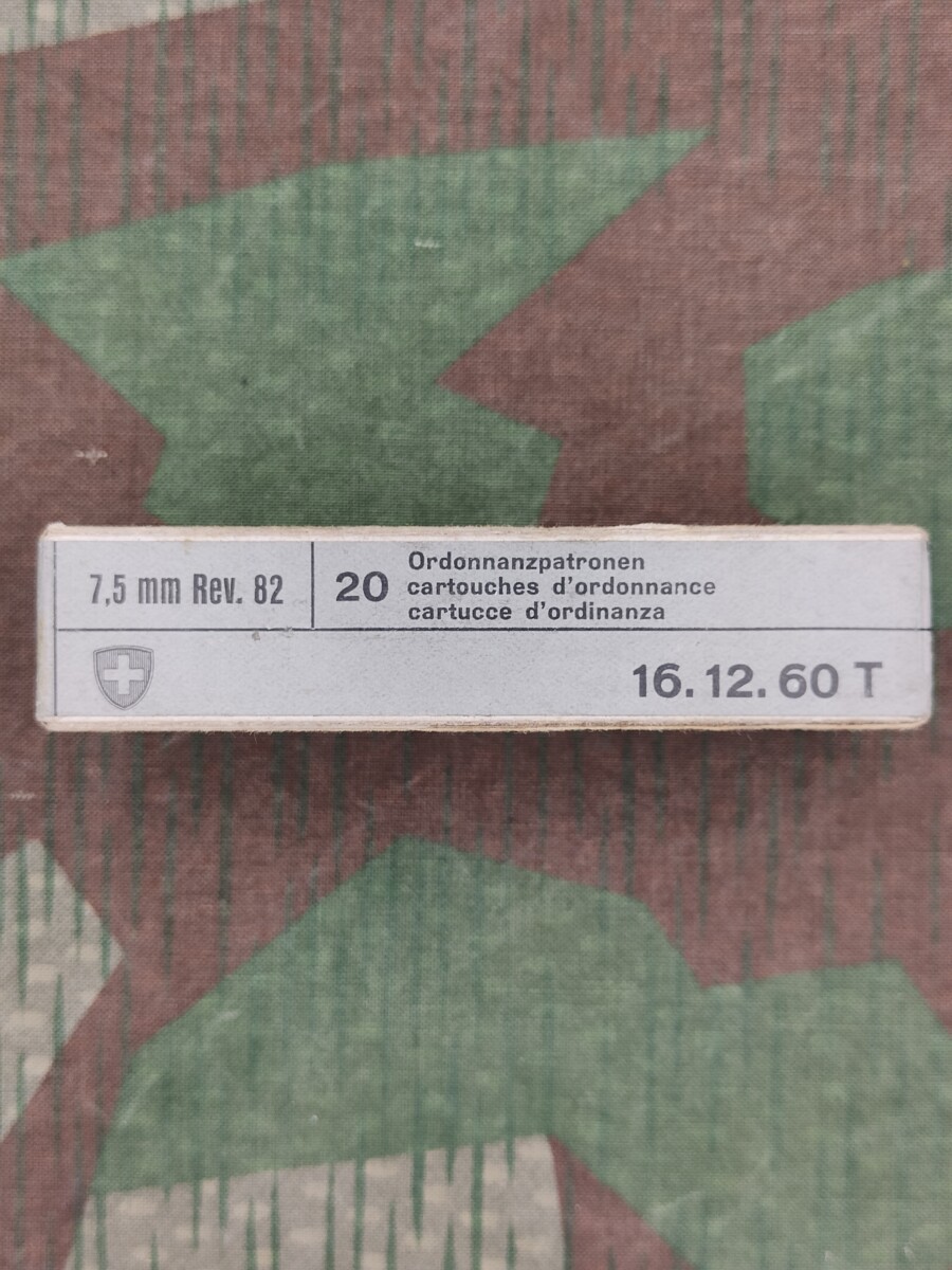 Aufschrift: 7,5 mm Rev. 82 20 Ordonnanzpatronen