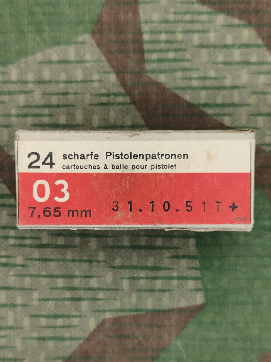 Aufschrift: 24 scharfe Pistolenpatronen 03 7,65 mm