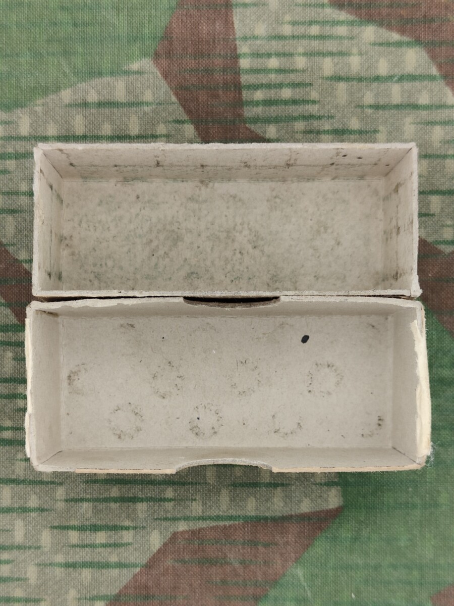Die Munitionsschachtel ist leer und hat eine 2-sprachige Aufschrift.