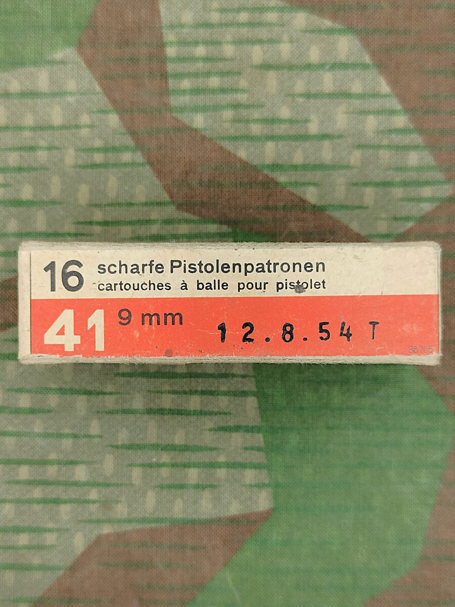 Aufschrift: 16 scharfe Pistolenpatronen 41 9 mm