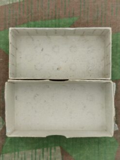Die Munitionsschachtel ist leer und hat eine 3-sprachige Aufschrift.