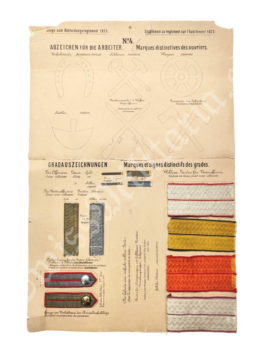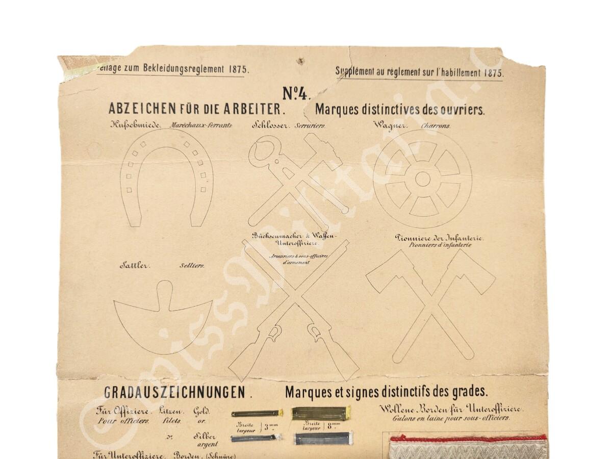 Aufschrift: BEILAGE ZUM BEKLEIDUNGSREGLEMENT 1875 No. 4. ABZEICHEN FÜR DIE ARBEITER. GRADAUSZEICHNUNGEN.