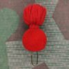 Der Pompon aus Wolle misst ca. 38 mm im Durchmesser und wird oberhalb des Deckels, mittels der aus 1.2 mm dickem Messing hergestellten Drahtschlaufe, in die Lederlasche eingesetzt.