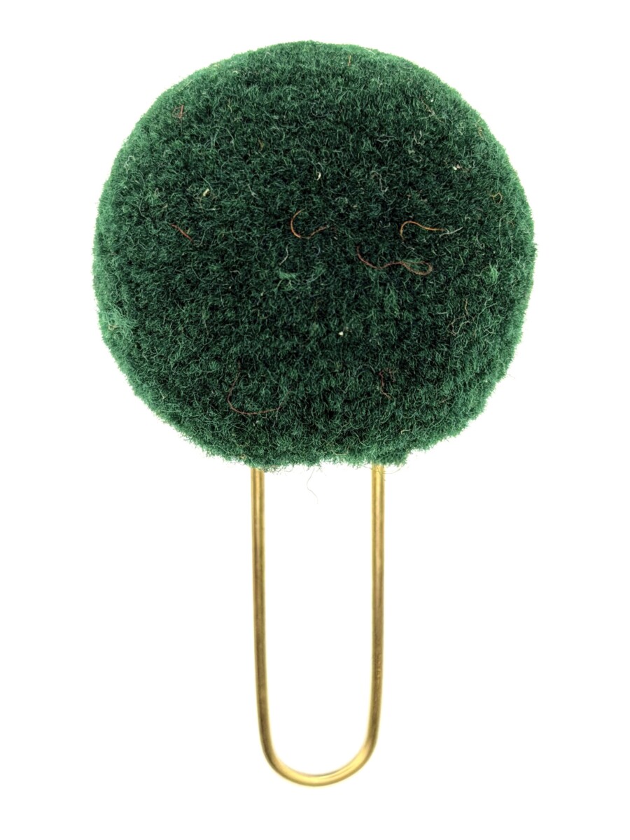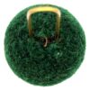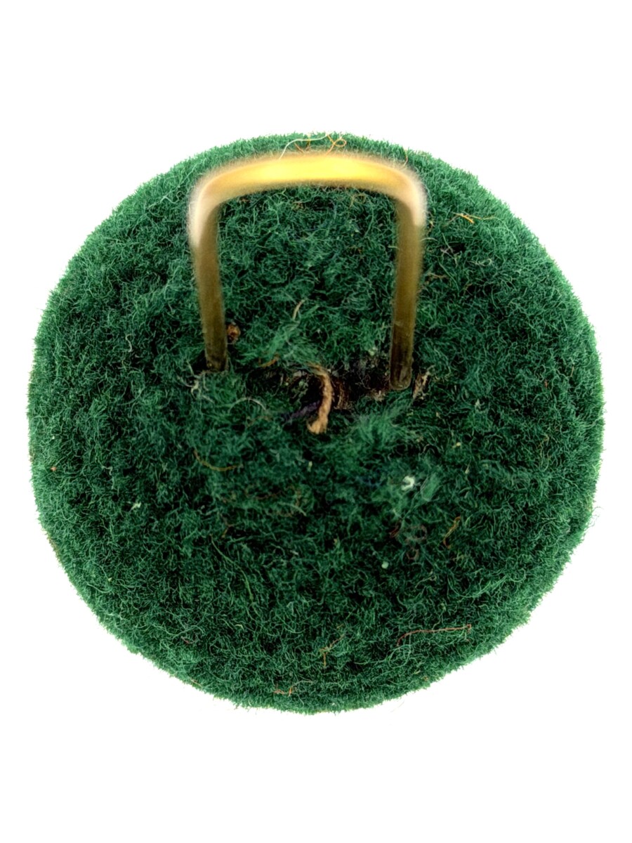 Der Pompon aus Wolle misst ca. 38 mm im Durchmesser und wird oberhalb des Deckels, mittels der aus 1.2 mm dickem Messing hergestellten Drahtschlaufe, in die Lederlasche eingesetzt. Durch das Einsetzten der Ganse oder Kokarde, wird der Pompon am Tschako fixiert.