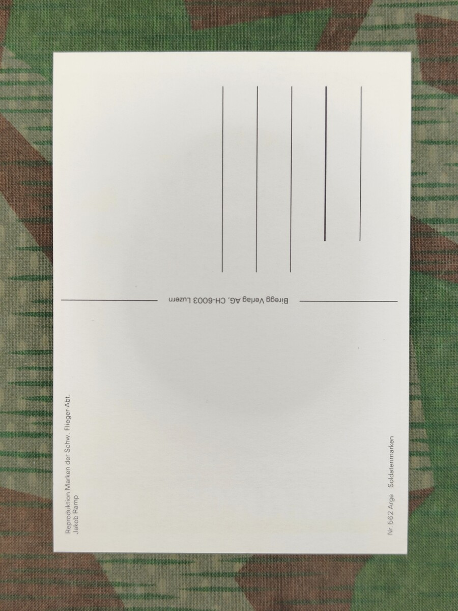 - Rückseite: Reproduktion Marken der Schw. Flieger-Abt. Jakob Ramp; Nr. 562 Arge Soldatenmarken; Biregg Verlag AG, CH-6003 Luzern