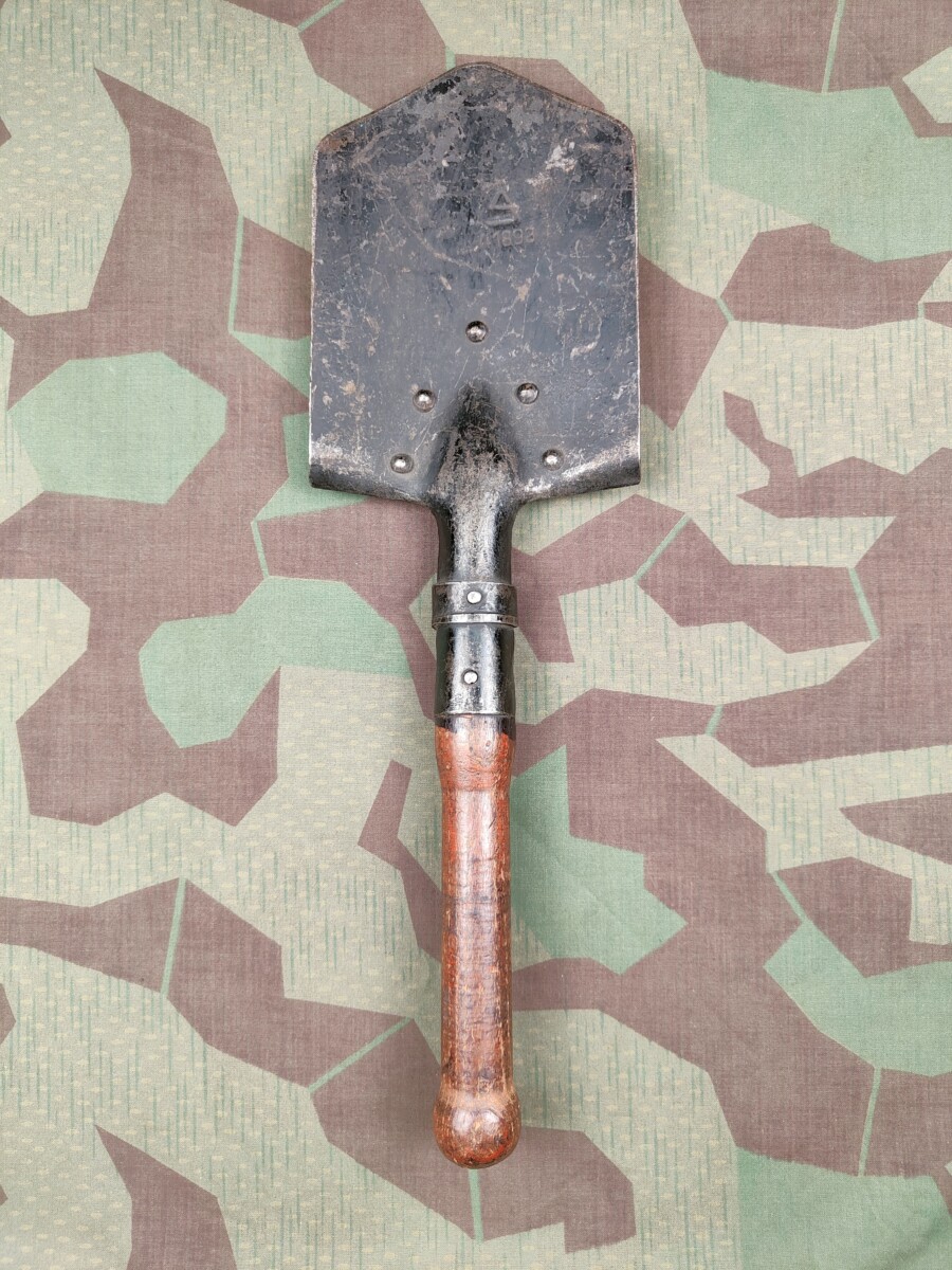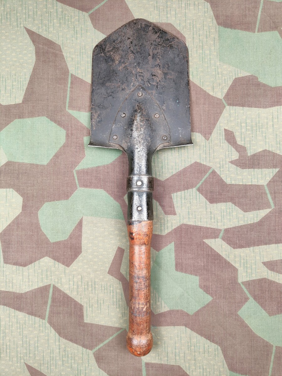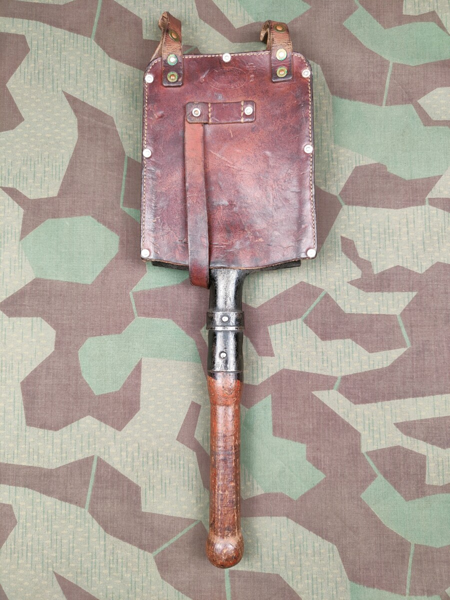 Der Spaten hat einen runden Stiel. Es wurden oftmals alte Lederhüllen verwendet und für die neuen Spaten modifiziert. Man erkennt sie an den alten Nieten aus Messing. Für die Modifikation wurden die neuen Nieten aus Aluminium genommen.
