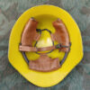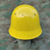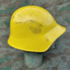 Der Helm wurde aus alten Armeebeständen für den Zivilschutz wieder verwendet und erhielt eine gelbe Lackierung und ein neues Innenfutter.