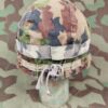 Der Überzug wird über den Stahlhelm gestülpt und mittels vier Haken sowie das Zusammenziehen der Schnur fixiert.