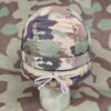 Der Überzug wird über den Stahlhelm gestülpt und mittels vier Haken sowie das Zusammenziehen der Schnur fixiert.