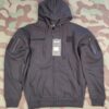 Die taktische Kapuzenjacke ist mit verschiedenen Klettflächen und Taschen versehen. In der Tasche beim Oberarm hat es einen Ausgang für Kopfhörer. Die Jacke gibt warm und ist sehr bequem.