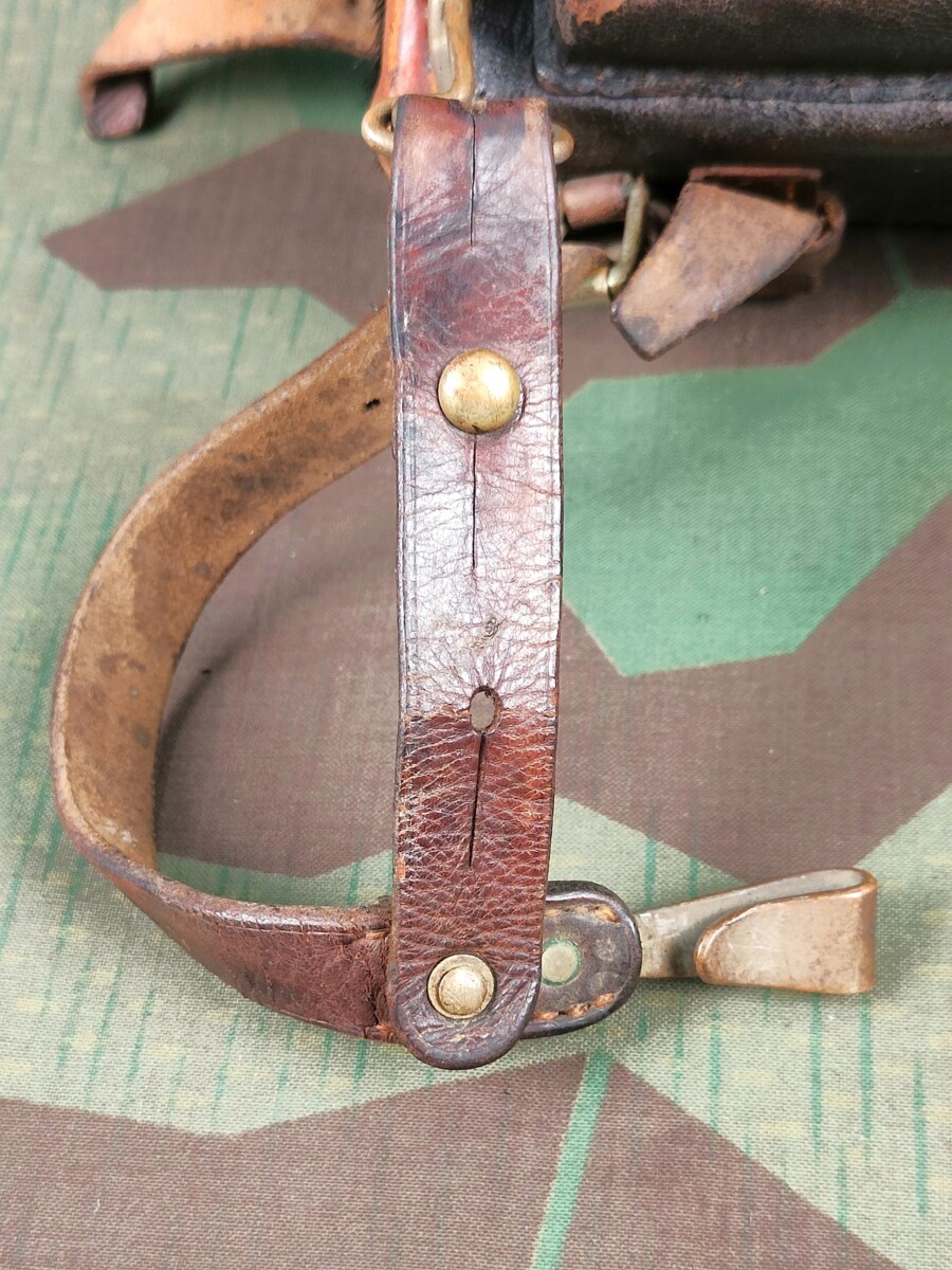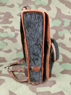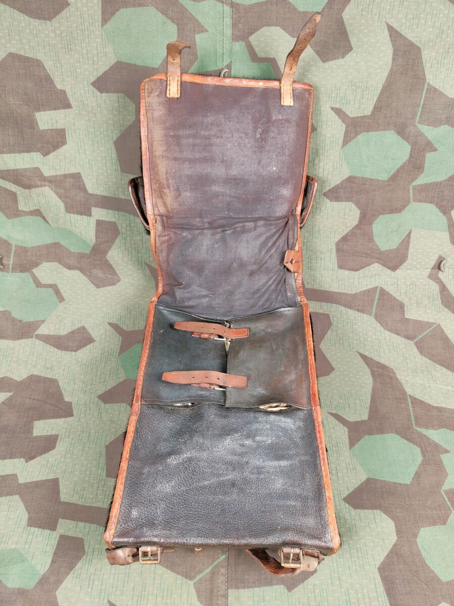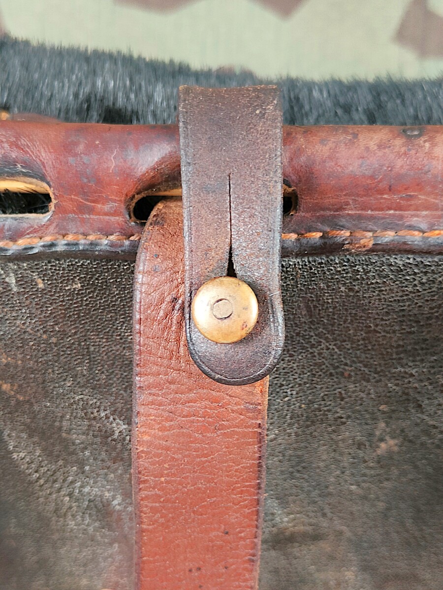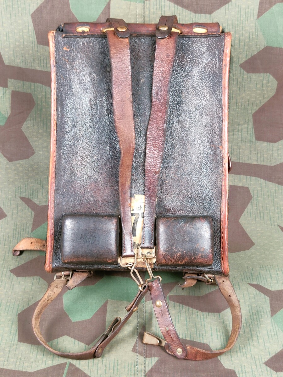 Bei diesem Tornister handelt es sich um ein schmales, langes Modell der Ordonnanz 1898 für Offiziere. Bis zum 1. Weltkrieg hat man schwarzes Seehundfell für die Offizierstornister verwendet. Während des Krieges hat man auf braunes Kuhfell zurückgegriffen, welches auch nach dem Krieg weiter verwendet wurde.