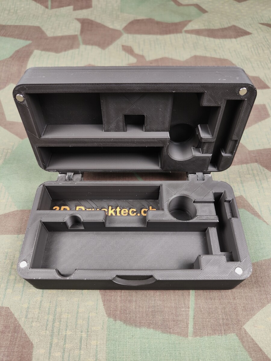 Der Behälter wurde spezifisch auf die Abmessungen des Verschlusses des Sturmgewehr 57 entwickelt und bietet eine optimale Passform für den sicheren Transport und die Lagerung. Ein zusätzlich Fach bietet Platz für Kleinmaterial wie Reinigungsutensilien.