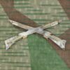 Das Emblem zeigt gekreuzte Vetterligewehre Ord. 1869. Das Abzeichen wurde zuerst von den Scharfschützen und ab 1874 von den Schützen verwendet.