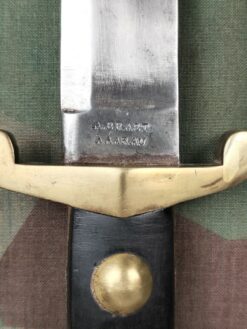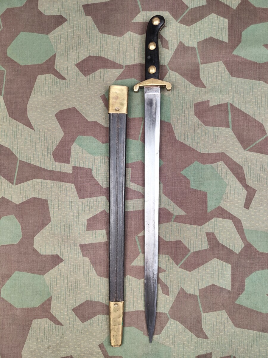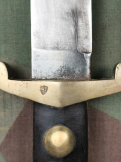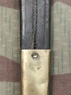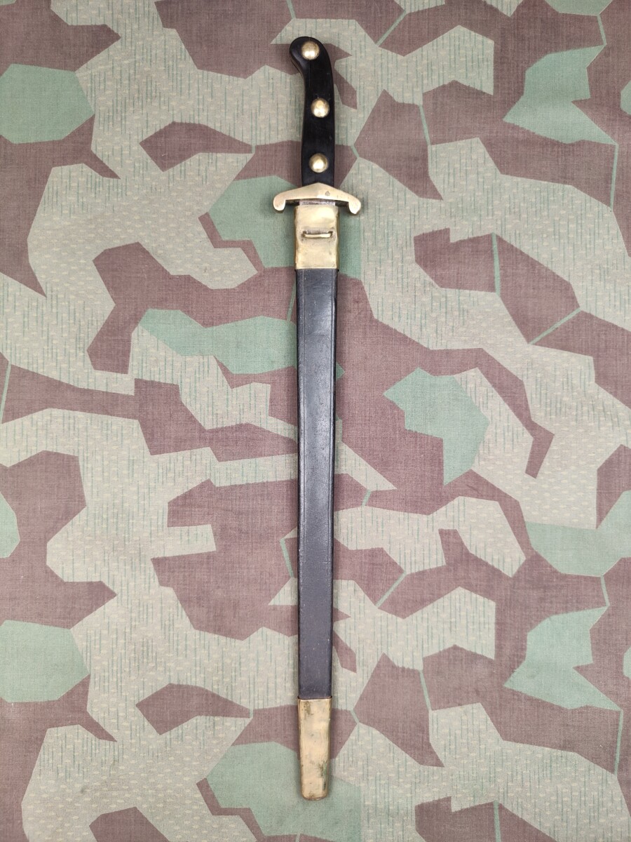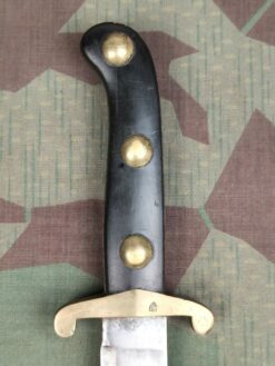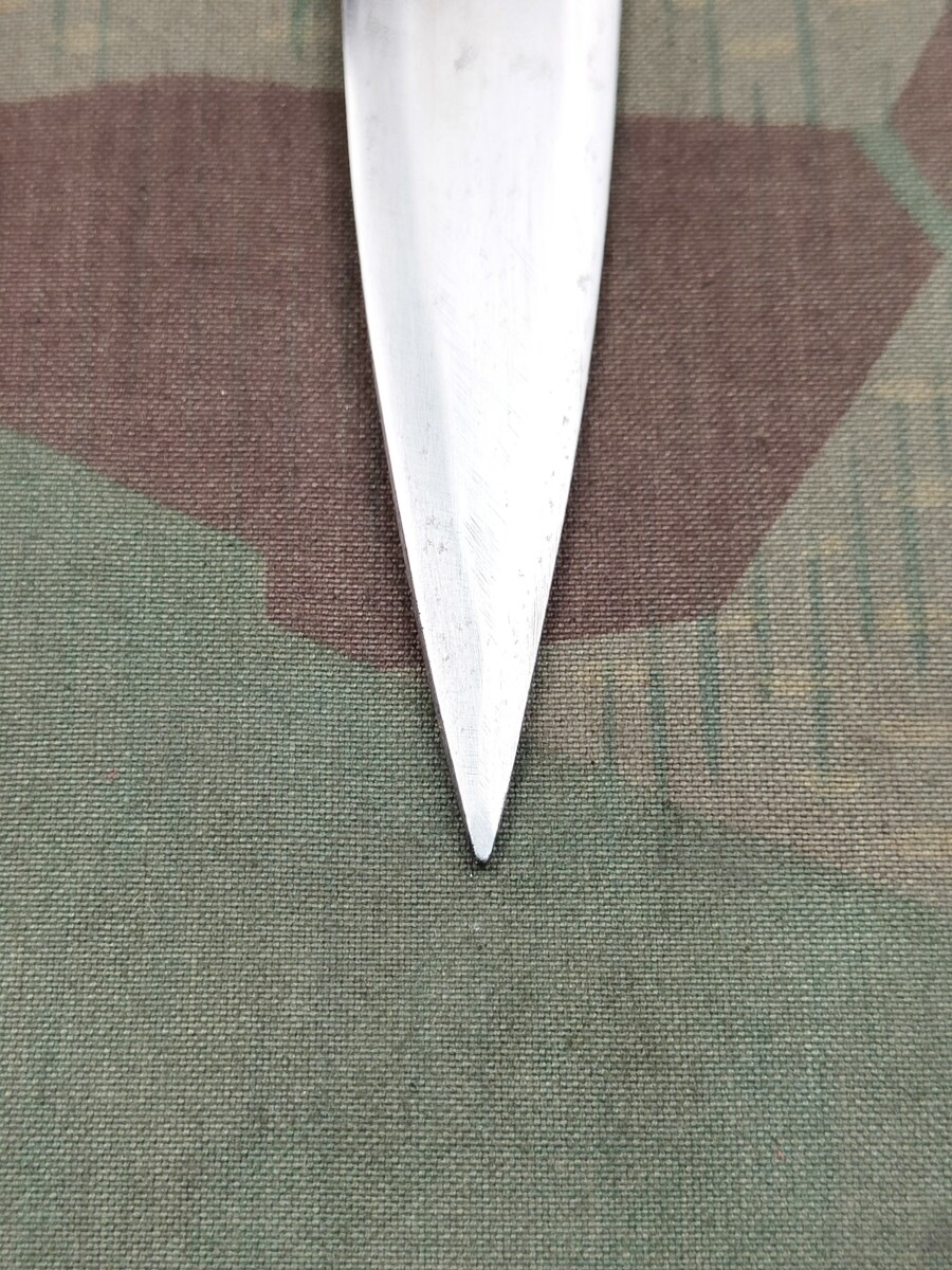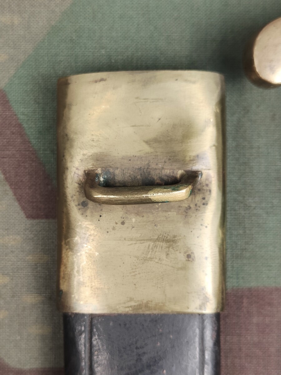 Schöner Zustand gemäss Bilder. Der Riemenbügel ist gegen den Stiefel gebogen. Die Scheide ist aufgrund des Alters geschrumpft und die Klinge lässt sich deswegen nicht mehr vollständig in die Scheide führen (4 mm).