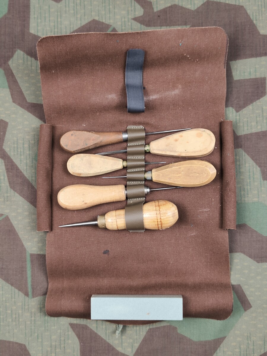 Die Werkzeugtasche beinhaltet diverse Ahlen, vermutlich für einen Sattler.