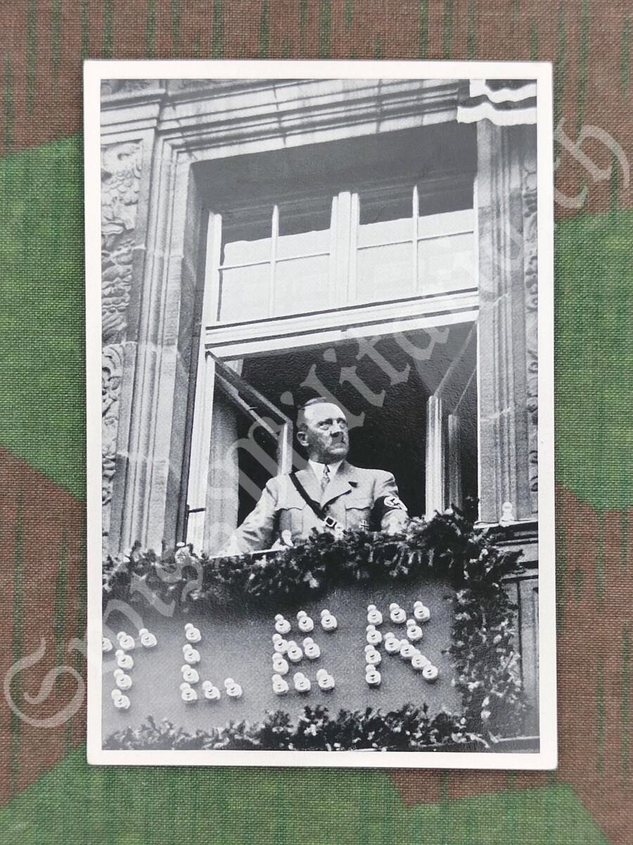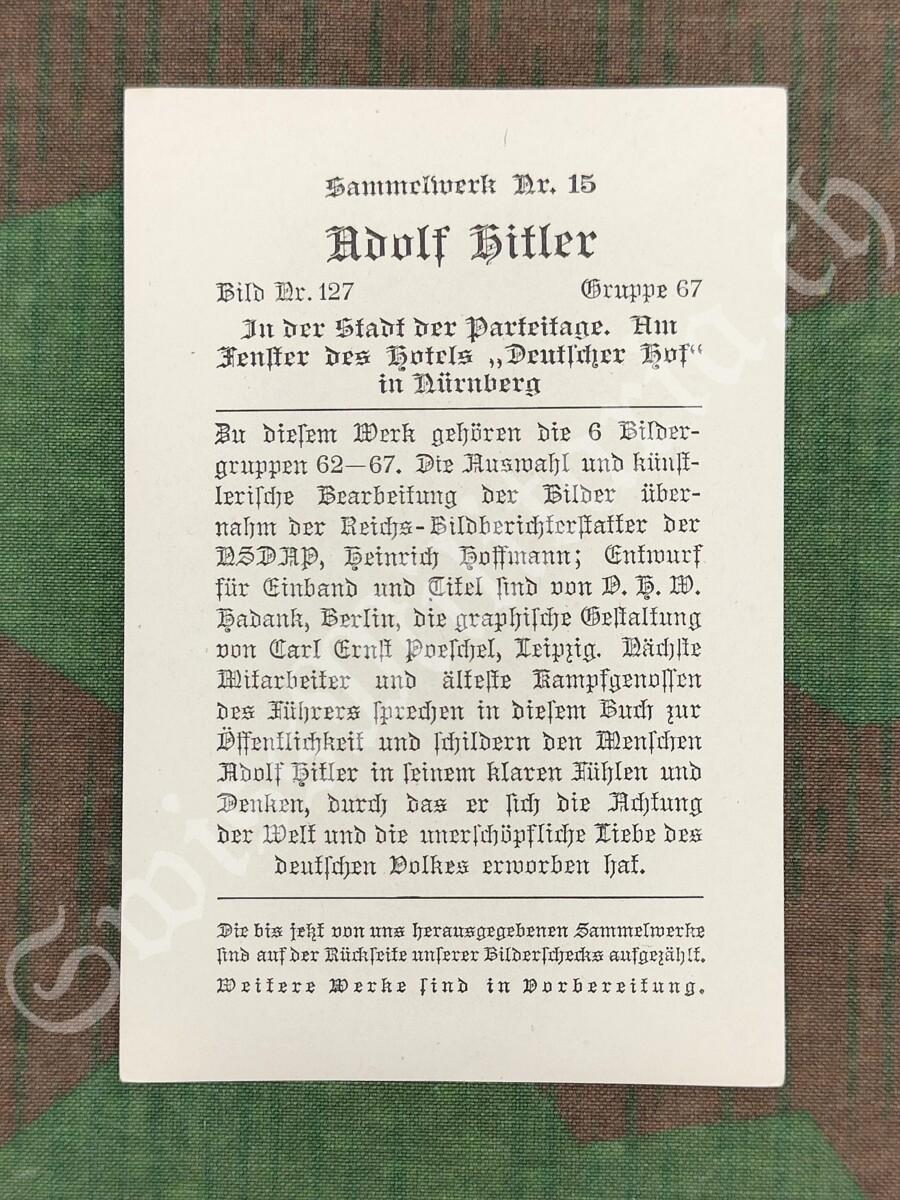 Zigarettenbild, Sammelwerk Nr. 15, Gruppe 67, Bild Nr. 127, In der Stadt der Parteitage. Am Fenster des Hotels „Deutscher Hof“ in Nürnberg